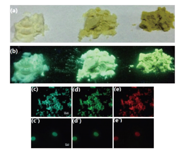 图2 质量比为1∶450、1∶70、1∶20的CDs@淀粉粉末在日光下(a)和紫外光下(b)图像;质量比为1∶70的CDs@淀粉粉末在紫外(c和c')、蓝光(d和d')、绿光(e和e')激发下的荧光图像[63] Fig. 2 Photographs of CDs@starch powder with a mass ratio of 1∶450,1∶70,1∶20 under sunlight (a) and ultraviolet (b). Fluorescence photographs of CDs@starch powder with a mass ratio of 1∶70 excited by ultraviolet(c and c'), blue light(d and d'), and green light(e and e') [63]. Copyright 2014, Royal Society of Chemistry |