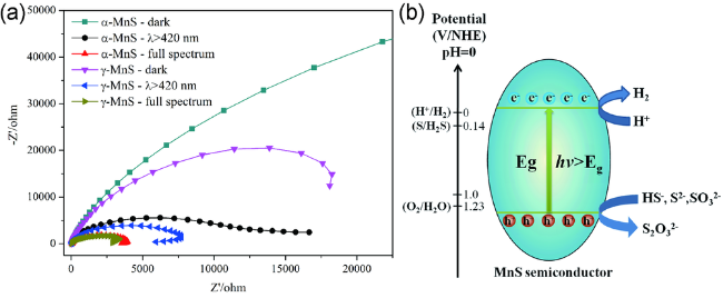 2S制氢性能进行了研究。结果表明: α, γ-MnS在可见光下都具有光解H2S制氢活性, 且相比于热力学稳定相的α-MnS (4.24 μmol/(g·h)), 亚稳态的γ-MnS (23.38 μmol/(g·h))具有更好的催化性能。相对于可见光, α, γ-MnS在全光谱下的产氢速率明显提高, 其中γ-MnS在全光谱下具有最大的光解H2S制氢活性, 其产氢速率可达 2272.69 μmol/(g·h)。值得注意的是, 在6 h的光催化测试过程中, α, γ-MnS都展示较好的抗光腐蚀能力和光催化稳定性。此外, 对α, γ-MnS光催化分解H2S制氢机理进行了分析, 通过对α, γ-MnS光电化学性质的研究, 对其光催化活性存在差异的原因进行了探讨。]]> |